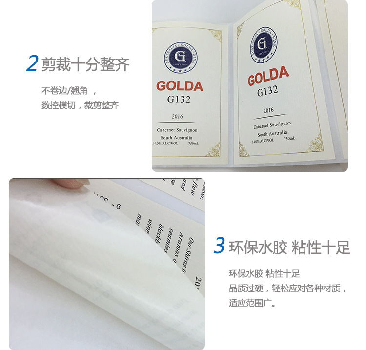 產(chǎn)品名稱:酒類不干膠標(biāo)簽紙 顏色:?jiǎn)紊?、四色、專?使用膠型:油膠、水膠、熱熔膠 規(guī)格:根據(jù)客戶自己定制 形狀:圓形、長(zhǎng)方形、橢圓形、自定義形狀等 使用底紙:黃色離型紙,白色離型紙,白色格拉辛等 材質(zhì):鏡面不干膠,PVC不干膠,易碎紙,銅板不干膠,牛皮紙等