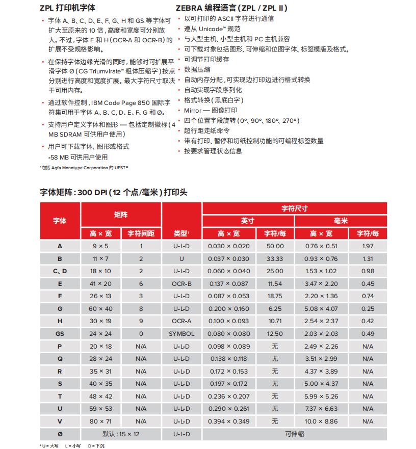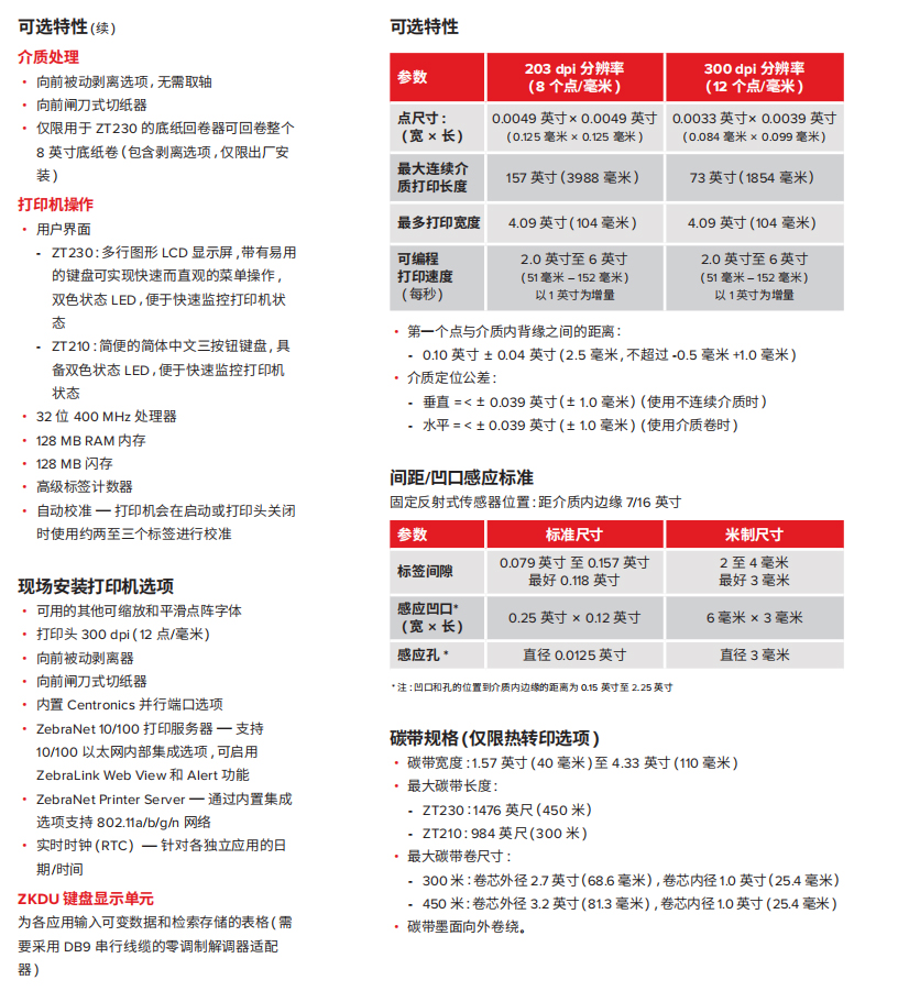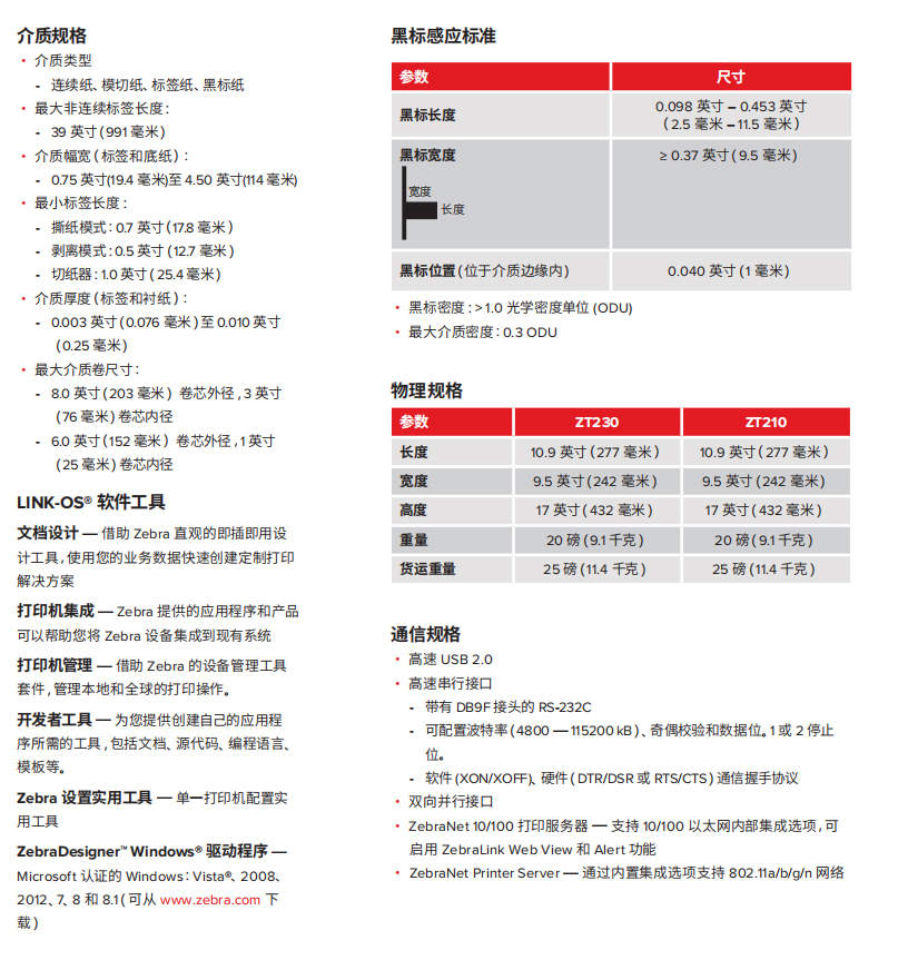 以下規(guī)格僅供參考,并且基于使用Zebraa? 原廠耗材對 ZT200? 工業(yè)系列打印機所進行的測試。測試的結(jié)果會因?qū)嶋H的應(yīng)用設(shè)置或使用非建議的Zebra品牌耗材而存在差異。Zebra始終建議通過測試來檢驗應(yīng)用。